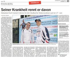 Sebastian Koch trainiert intensiv für den Gladbacher Mukoviszidose-Lauf am 27. Juni. Der 28-Jährige hat seit seiner Geburt Mukoviszidose, eine nicht heilbare vererbte Stoffwechselerkrankung. Sein Ziel ist es, einen Marathon zu laufen. Bergisch Gladbach. Dauernder Husten mit Auswurf, häufige Lungenentzündungen und Atemnot, Symptome, die eigentlich starke körperliche Anstrengungen so gut wie unmöglich machen. Doch Sebastian Koch bietet seiner Erkrankung Paroli und zieht die Laufschuhe an. …weiterlesen »